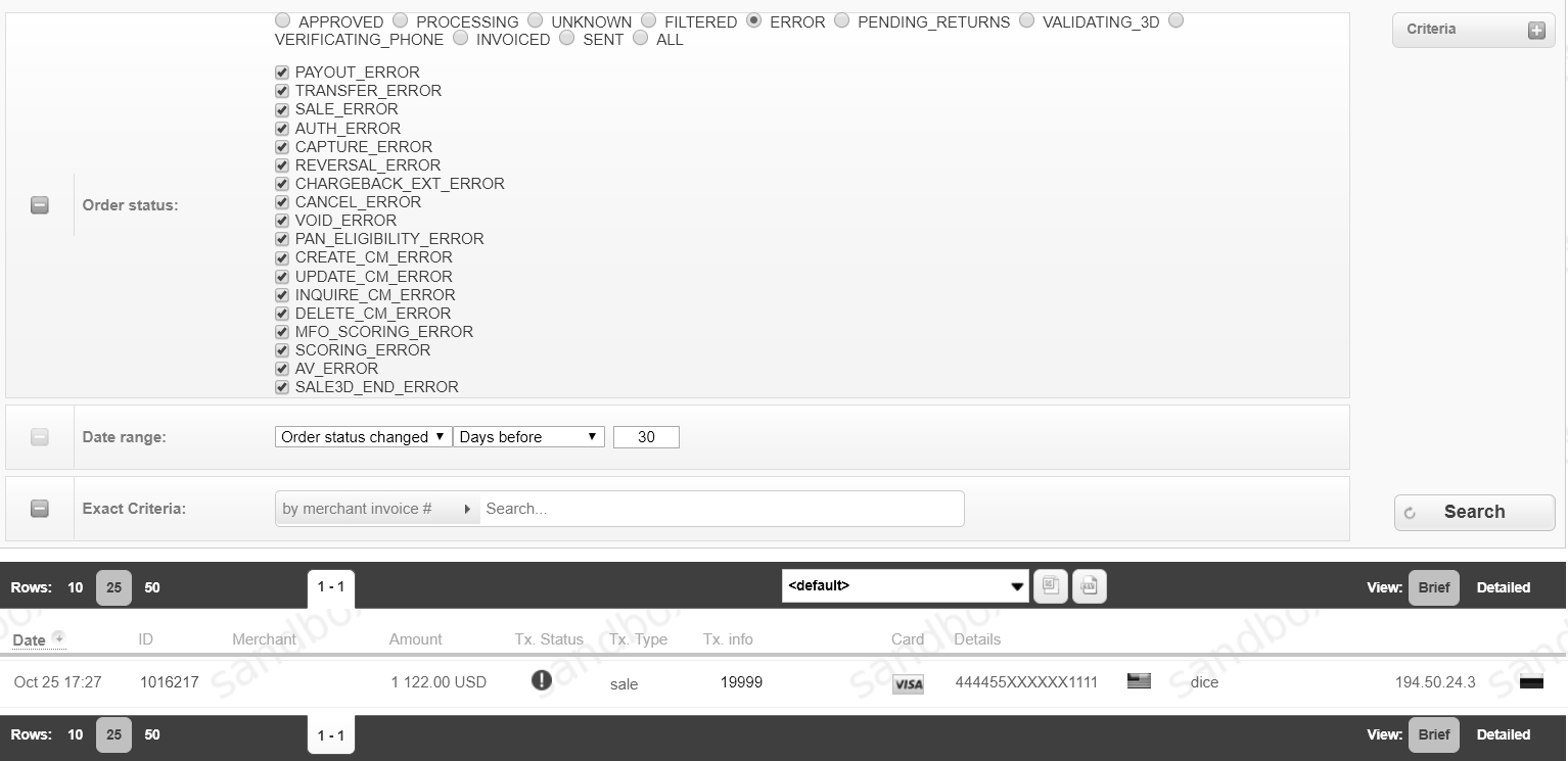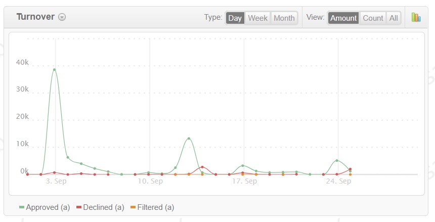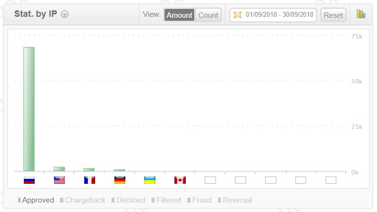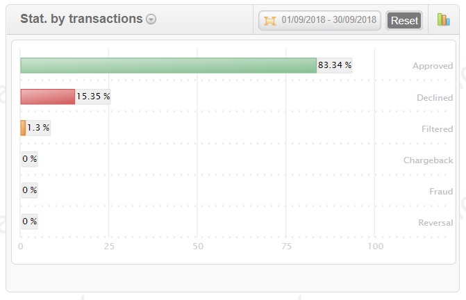 button: the ratio by volume of transactions or by amount of payments, as well as by type of transactions (sale, capture, transfer, etc). Dns-pay Payment Gateway also displays statistics on negative activity and earnings.