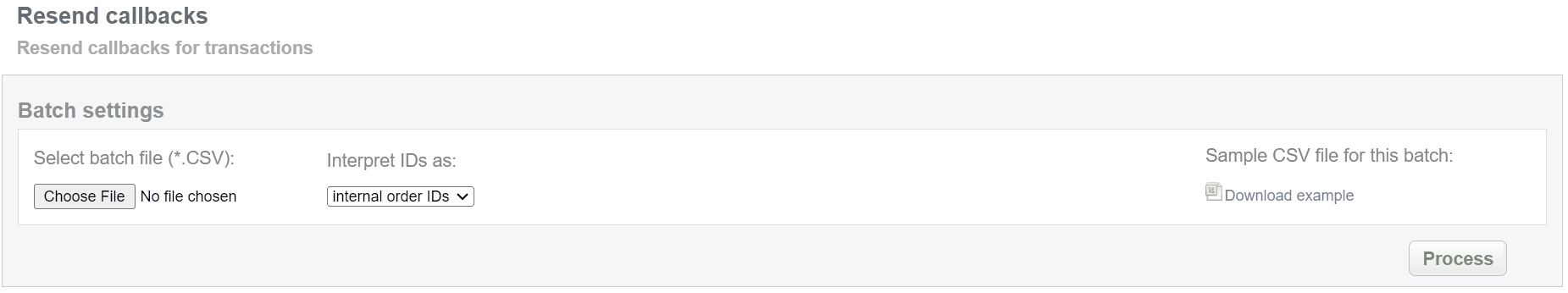 This batch operation can be useful if information on the final status of transactions is available in Dns-pay system and for some reason is not available in the Connecting Party system. Collect the order IDs, assigned by Dns-pay system to the CSV file and upload it to send new callback notifications. An example of CSV file for upload is available on the same screen.